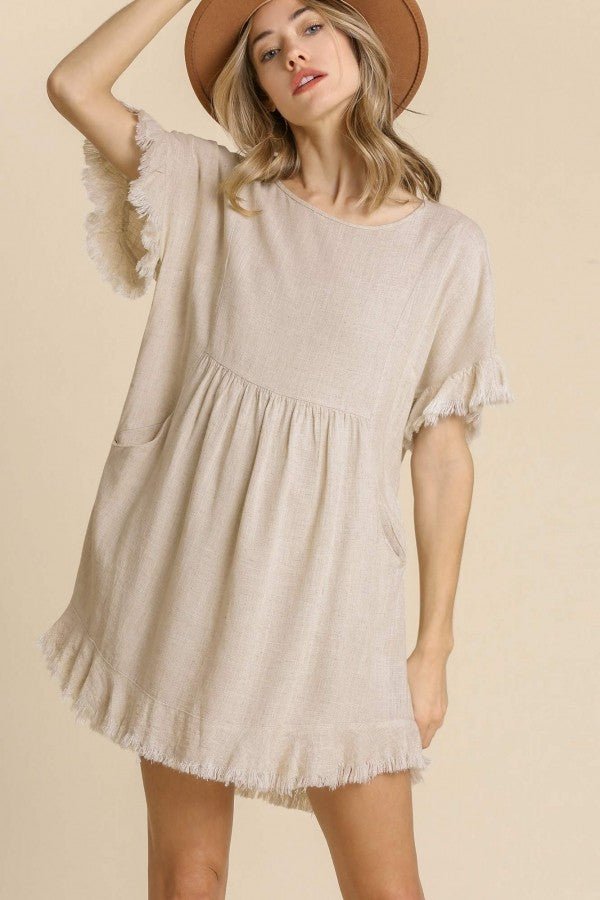 This Umgee dress is a lightweight linen blend, and it features short ruffled sleeves, a round neckline, pockets, and frayed trim. This dress look cute paired with a fun headband and a pair of wedged shoes.